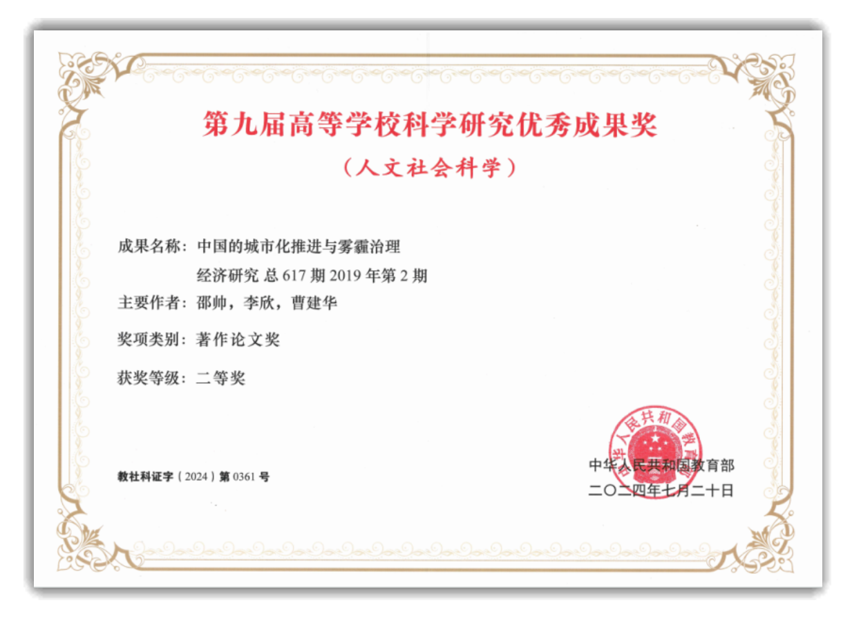 图为教师李欣获得教育部高等学校科学研究优秀成果二等奖