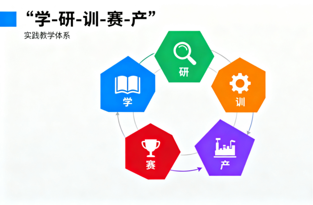 图为“学-研-训-赛-产”五位一体实践教学体系