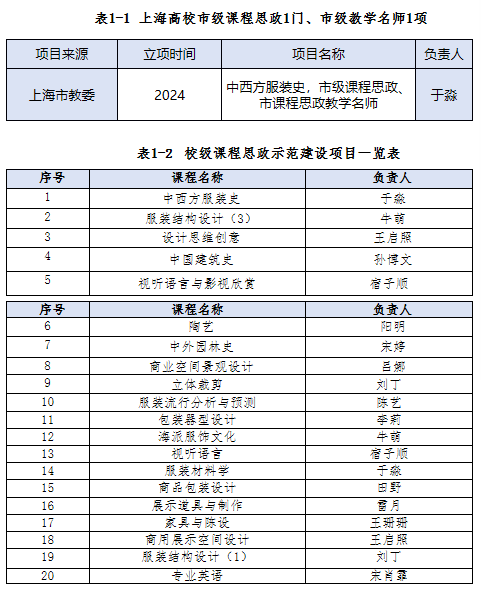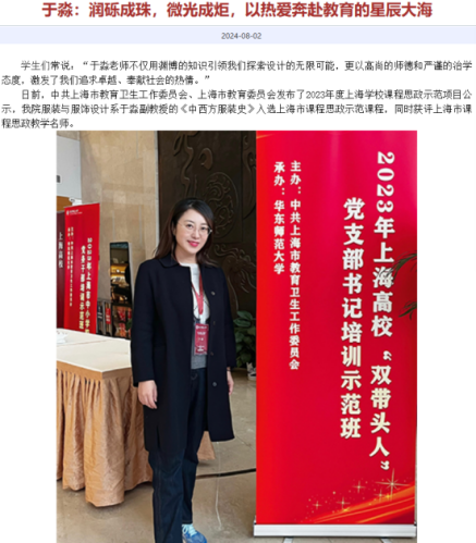 通过思想政治理论素养提升、课程思政项目申报经验分享会、课程思政集体备课等形式,强化教师课程思政育人意识,引导教师将立德树人根本任务具化到学院人才培养目标、专业培养目标和课程育人目标中,充分挖掘课程中的思政元素,在专业课程着重融入职业素养和使命担当、在实践课程侧重融入创新精神和社会责任。例如,上海市课程思政教学名师于淼副教授聚焦“艺术+思政”,深耕《中西方服装史》课程,创造性挖掘思政元素,将专业课、思政课和实践课深度融合,主持讲授课程思政专题分享会,牵头推进产教融合,打造“传承中华优秀传统文化”品牌项目,带领学生走访苏绣、云锦等非遗传承人,推动传统工艺与现代设计融合。