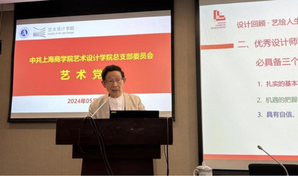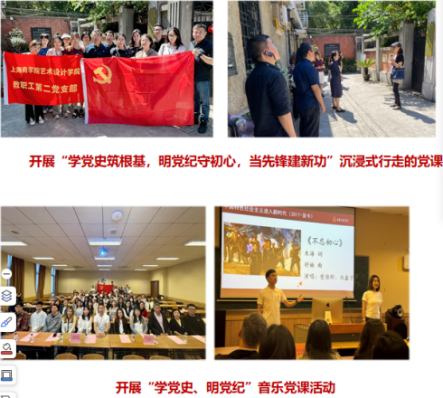 坚持“党的领导+人才培养”双驱动,“基层党组织+基层教学组织”双联动,“主题党日活动+教学活动”双行动,以支部主题党日活动、教职工政治理论学习、师德师风建设月为载体,围绕“大力弘扬教育家精神 加快建设教育强国”主题,引导教师树立“躬耕教坛 强国有我”的志向与抱负,开创师德师风建设新局面。例如:邀请全国劳动模范、全国“五一”劳动奖章、全国轻工业劳动模范、上海市劳动模范(四届)、上海市科技功臣、上海市科技精英奖、中国设计事业终身成就奖等众多荣誉获得者刘维亚大师,为学院教职工、学生代表讲授艺术党课。依托区域化党建,开展“行走的党课”为党员师生讲授红色故事,依托“校校”党建共建,为学院师生开展音乐党课。立足学科专业特色,举办“启智润心”师生文化艺术设计作品展、上海商学院建校75周年师生AI作品展等活动,通过艺术作品的形式引导教师当好学生的“四个引路人”。