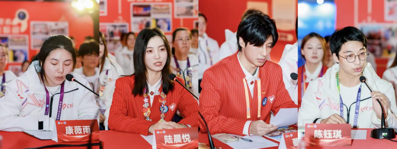 以志愿赴进博,以风采耀青春。活动在《年轻的力量》上商“小叶子”风采展示中拉开序幕。随后,我校首位进博会长期管理岗学生志愿者康薇雨,中共党员、本届进博会志愿者领队陆晨悦,两度出征的“戎耀小叶子”、退役大学生士兵蔡云卿,我校原创话剧主演之一、现服务于青浦公安分片区治安岗的陈钰骐分别结合自身志愿服务经历,分享此次进博之旅的感悟。他们表示:将珍惜在进博会服务的机会,把岗位当作“知行合一”的最佳课堂,在实践中提升解决实际问题的能力,在奉献中砥砺坚韧不拔的意志品质,用最高的服务标准和最好的精神面貌,为进博会的成功举办贡献智慧与力量。