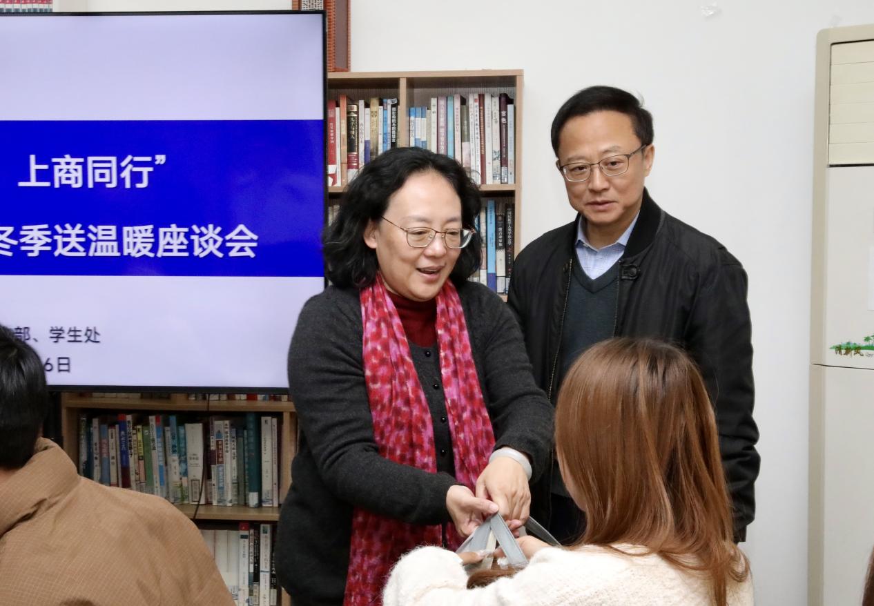 凛冬已至,温情不减。12月16日,我校在奉浦校区一站式学生社区爱心屋举办“暖冬护航 上商同行”冬季送温暖座谈会。校党委书记沈大明,校党委副书记、校长吴忠,校党委副书记、副校长劳晓芸出席会议,相关职能部门负责人与同学们齐聚一堂,共话成长。座谈会由劳晓芸主持。