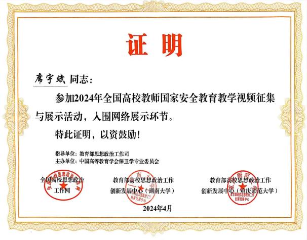 图4. 2024年全国高校教师国家安全教育教学视频征集与展示活动入围证书 |