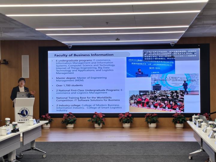 会上,劳晓芸代表上海商学院致辞并介绍学校基本概况。她指出,上海商学院立足商科特色,在酒店管理、商务信息、数字经济等领域积累了丰富的教学与科研经验,此次与INSEAD的交流,是学校对接国际商科教育资源、推进国际化发展的重要契机。胡笑寒详细介绍了我校商科教育特色与综合优势。上海商学院作为应用技术型商科院校,始终聚焦数字经济与产业发展需求,在中外合作办学、教育数字化建设、XR、AI赋能教育教学方面都有着丰富的探索和实践经验。