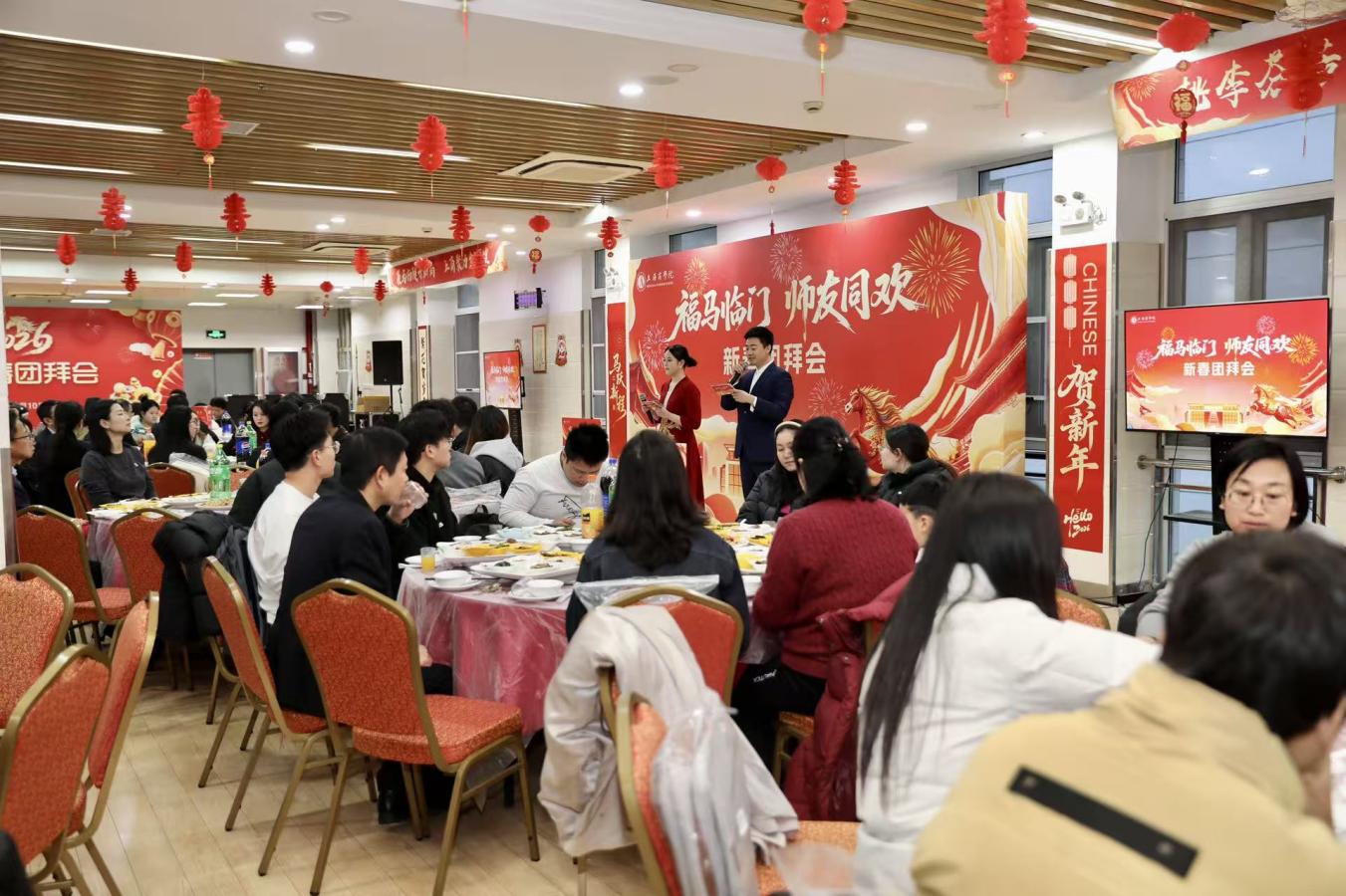 新春肇启,华章待书。2月10日正值农历小年,上海商学院2026年学生新春团拜会在中山西路校区学生食堂举行。全体校领导、各学院党政领导、职能部门负责人代表与100余名留校学生欢聚一堂,共同迎接新春佳节的到来,活动由文法学院辅导员董健鹏、商务信息学院学生赵心敏主持。